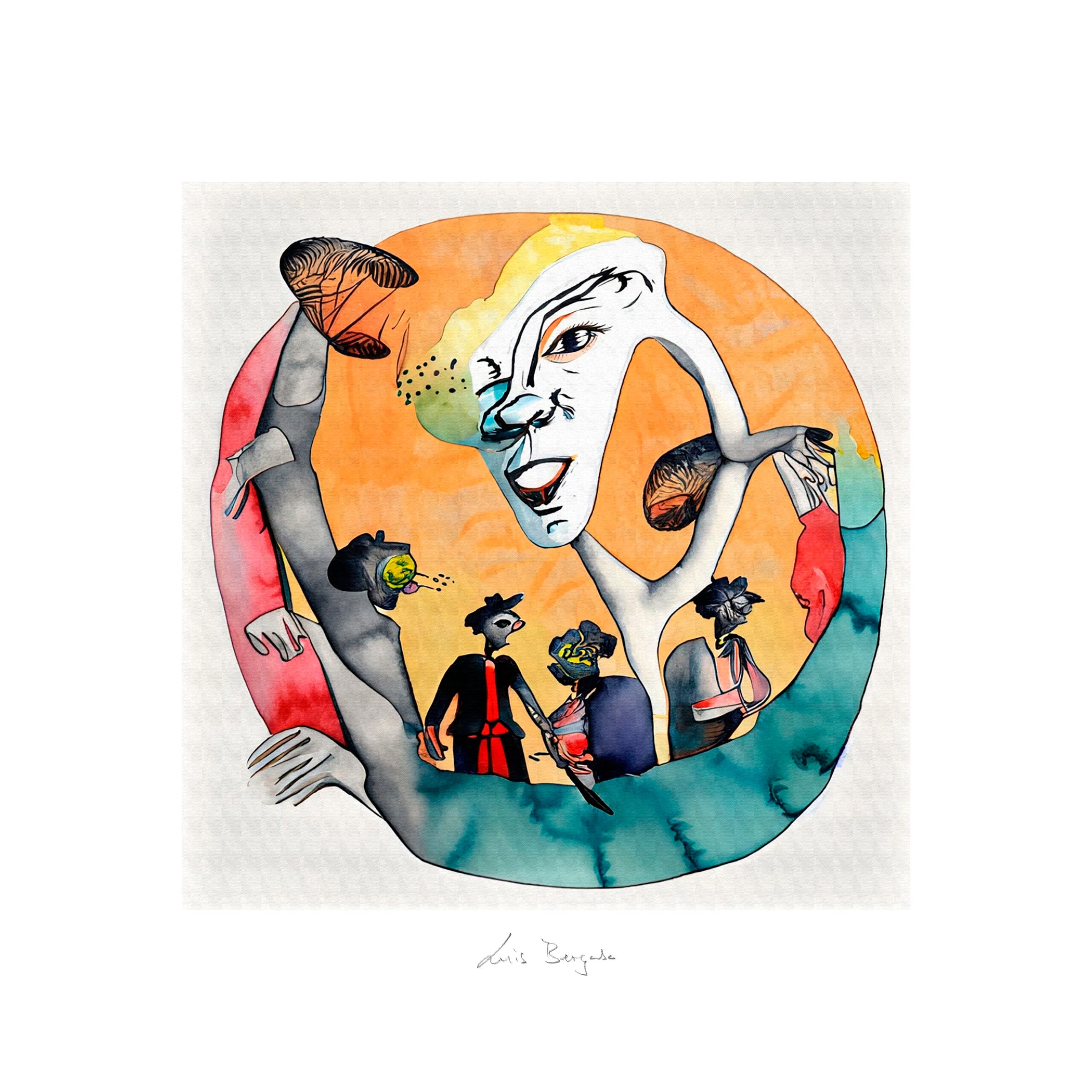 Con su composición circular y su estilo surrealista, nos sumerge en un microcosmos fantástico donde las figuras humanas se entremezclan con elementos orgánicos y arquitectónicos. Un rostro enigmático, con una expresión que oscila entre la alegría y la inquietud, domina la parte superior de la composición. Debajo, un grupo de personajes, con rasgos caricaturescos y vestimentas singulares, parecen interactuar en un escenario teatral.