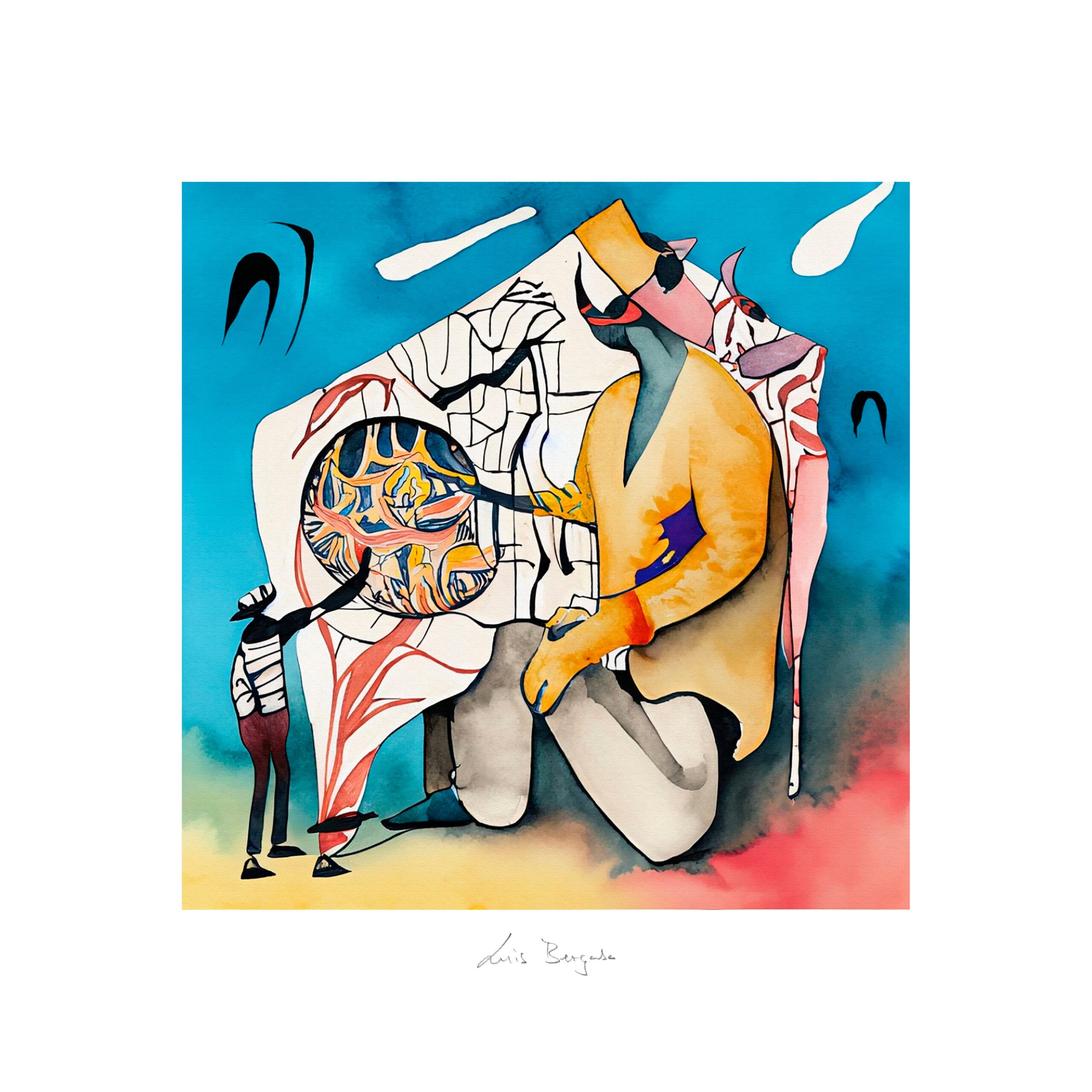 Con su estilo surrealista y enigmático, nos presenta una escena donde la figura humana se fusiona con elementos arquitectónicos y orgánicos. Un hombre con cabeza de toro, ataviado con una chaqueta amarilla y un sombrero, domina la composición. Su mirada se dirige hacia un círculo que parece flotar en el espacio, conteniendo un laberinto de líneas y formas abstractas. A sus pies, una figura más pequeña tira de una cuerda que conecta con el círculo, como si intentara controlar o influir en él.