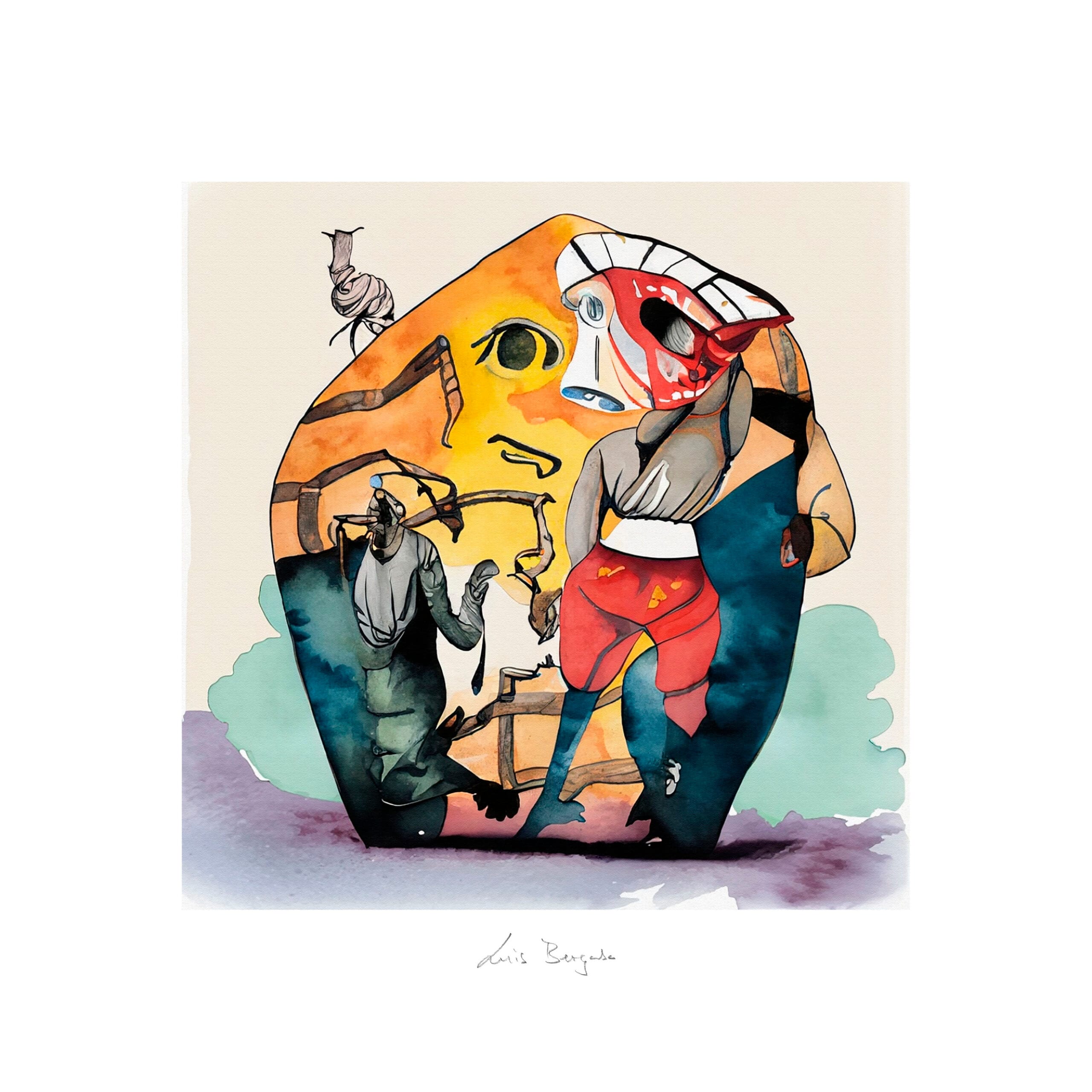 Con su estilo surrealista y simbólico, nos transporta a un universo onírico donde las formas humanas se funden con elementos orgánicos y arquitectónicos. En primer plano, una figura antropomórfica, ataviada con vestimentas que recuerdan a un guerrero antiguo, se yergue con solemnidad. Su cabeza, coronada por un yelmo inusual, parece ocultar un rostro enigmático.