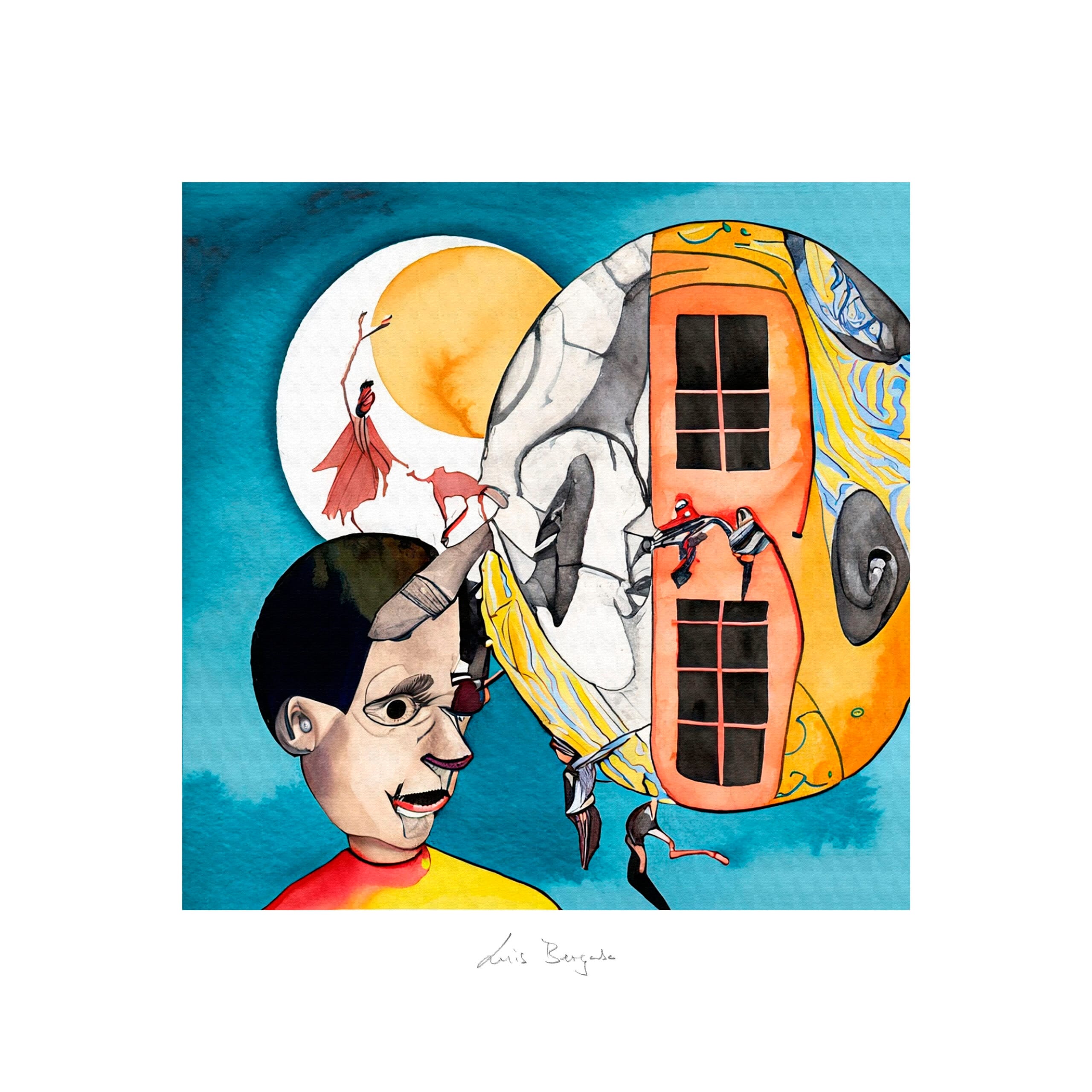 Esta obra, con su estilo surrealista y onírico, nos invita a un viaje a través de la imaginación, donde los límites entre la realidad y la fantasía se desdibujan. Un niño, cuyo rostro parece una máscara, observa con asombro una esfera que contiene un autobús fragmentado. A su lado, una figura alada danza bajo la luz de una luna dorada.