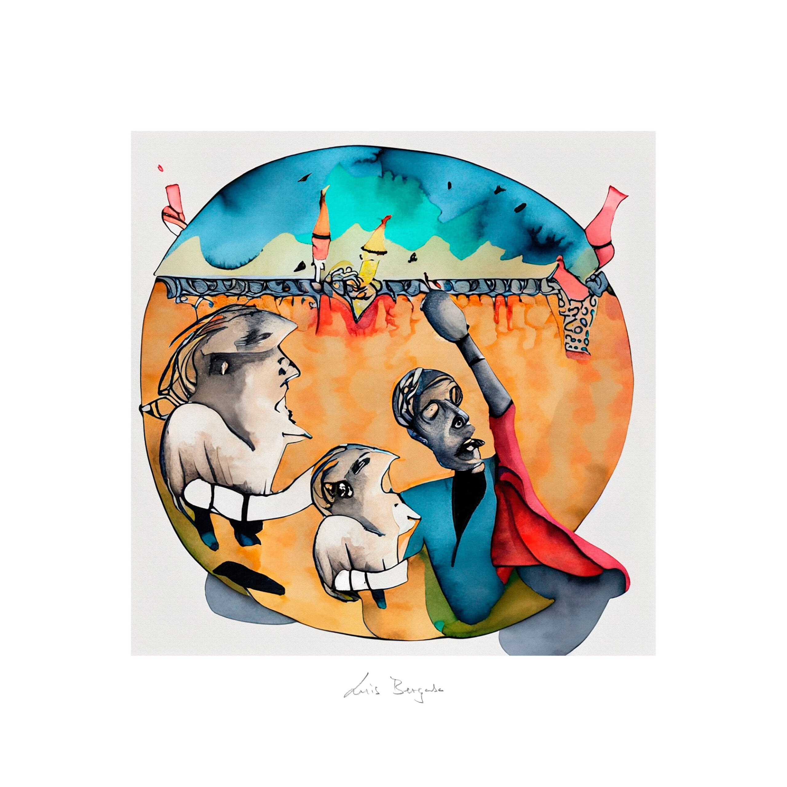 Con su composición circular y su estilo expresionista, nos presenta una escena cargada de dramatismo y simbolismo. Tres figuras, con rasgos grotescos y expresiones angustiadas, interactúan en un espacio claustrofóbico. Sus gestos y posturas transmiten una sensación de tensión y conflicto, como si estuvieran atrapados en una lucha interna o en una disputa sin salida.