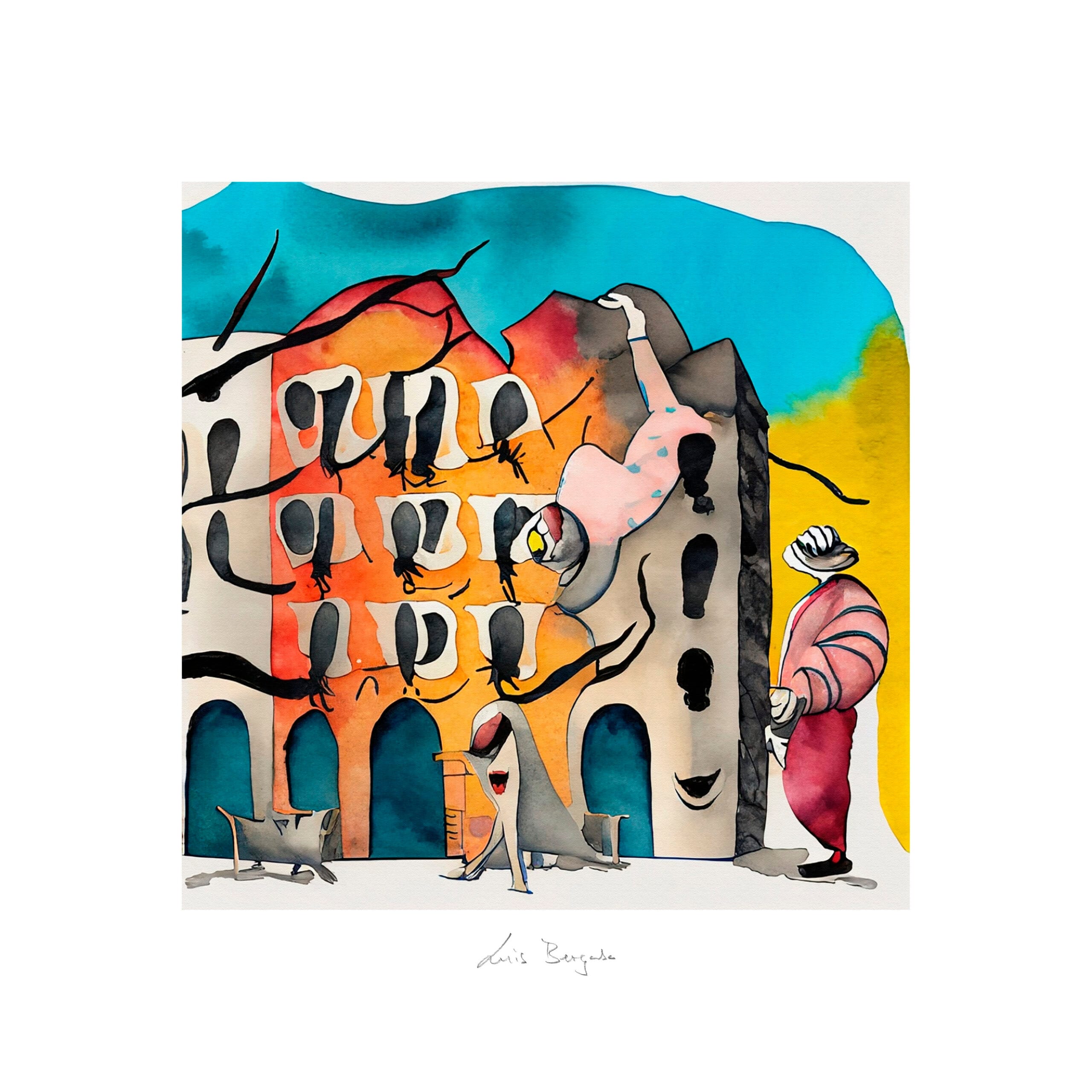 Esta obra, con su estilo surrealista y narrativo, nos transporta a una escena urbana donde lo cotidiano se mezcla con lo fantástico. Un edificio de fachada colorida y ventanas que asemejan ojos curiosos se alza imponente, mientras una figura acrobática desafía la gravedad, colgando de una de sus ventanas. En la calle, un personaje enigmático observa la escena con atención, mientras un pájaro de aspecto peculiar parece dialogar con él.