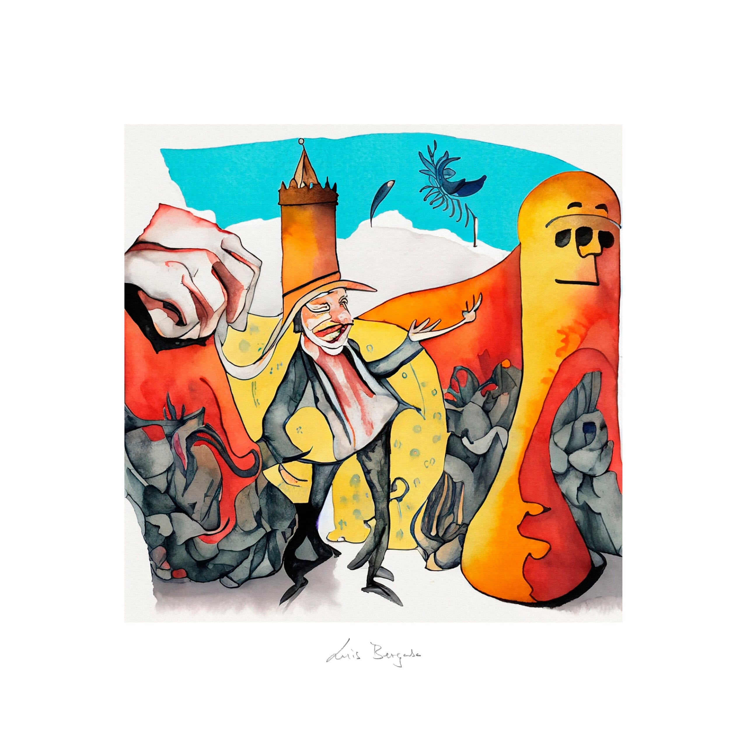 Impregnada de un humor sutil y una atmósfera surrealista, nos presenta un personaje peculiar que parece dirigir una orquesta invisible. Con su sombrero extravagante y una sonrisa pícara, el protagonista se erige como el maestro de ceremonias de este escenario fantástico.